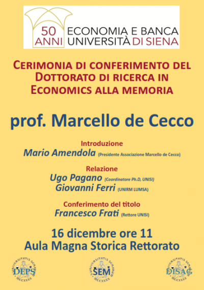 Il conferimento del Dottorato di ricerca in Economics, alla memoria, al Prof Marcello de Cecco sarà un altro importante momento per sancire anche quanta rilevanza abbiano avuto gli studi economici a Siena.