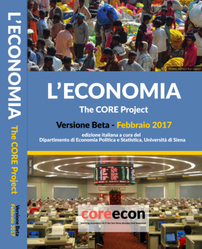 Il Dipartimento di Economia Politica e Statistica dell’Università di Siena coglie con entusiasmo l’opportunità di partecipare al progetto CORE e contribuire al suo sviluppo. Condividiamo pienamente la visione ispiratrice del progetto: dare agli studenti la possibilità di capire di cosa si occupa l’economia, con un approccio più ampio e aperto possibile, prima di insegnare loro uno specifico modello astratto. L’ebook sviluppato nell’ambito del progetto CORE realizza tale obiettivo, ed è per questo che ne abbiamo previsto l’adozione nell’insegnamento introduttivo di Economia politica della nostra università. Il DEPS ha realizzato l'edizione italiana di "The Economy", che include materiale specifico rilevante per il contesto italiano, sviluppato dal nostro gruppo di lavoro. La versione italiana è stata utilizzata dai nostri studenti del primo anno negli anni accademici 2014-2015 e 2015-2016.