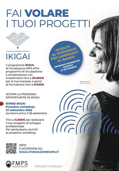 Con il programma IKIGAI Talenti puoi ricevere un contributo a fondo perduto fino a 6.000 Euro per lo sviluppo del tuo progetto di crescita professionale. Dal 2018, sono oltre 80 i progetti già sostenuti da Fondazione MPS e anche quest'anno sono state messe a disposizione oltre 20 borse per far accrescere il valore nel mercato del lavoro dei giovani che vivono o studiano a Siena, Arezzo e Grosseto.