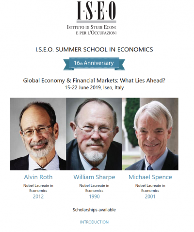 The I.S.E.O. Summer School in Economics is one of the few summer courses in the world featuring several Nobel Laureates. Organized by the I.S.E.O. Institute (a non profit institute chaired by Robert Solow), it's aimed at young professionals, researchers and graduate students (masters and phd) notably in Economics and in Finance. For its 16th edition, taking place in Iseo (Brescia, Italy) from 15-22 June 2019, the I.S.E.O. Summer School will feature Alvin Roth (Nobel Laureate 2012), William Sharpe (Nobel Laureate 1990) and Michael Spence (Nobel Laureate 2001). Further international economists will be announced later.